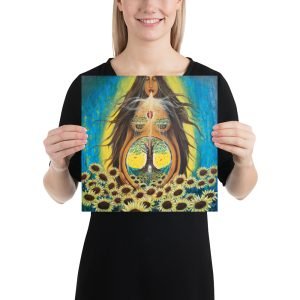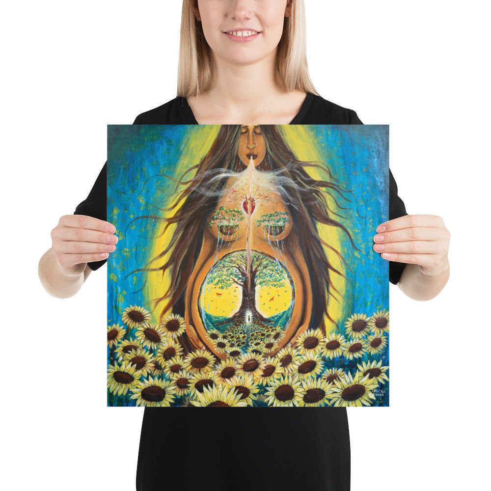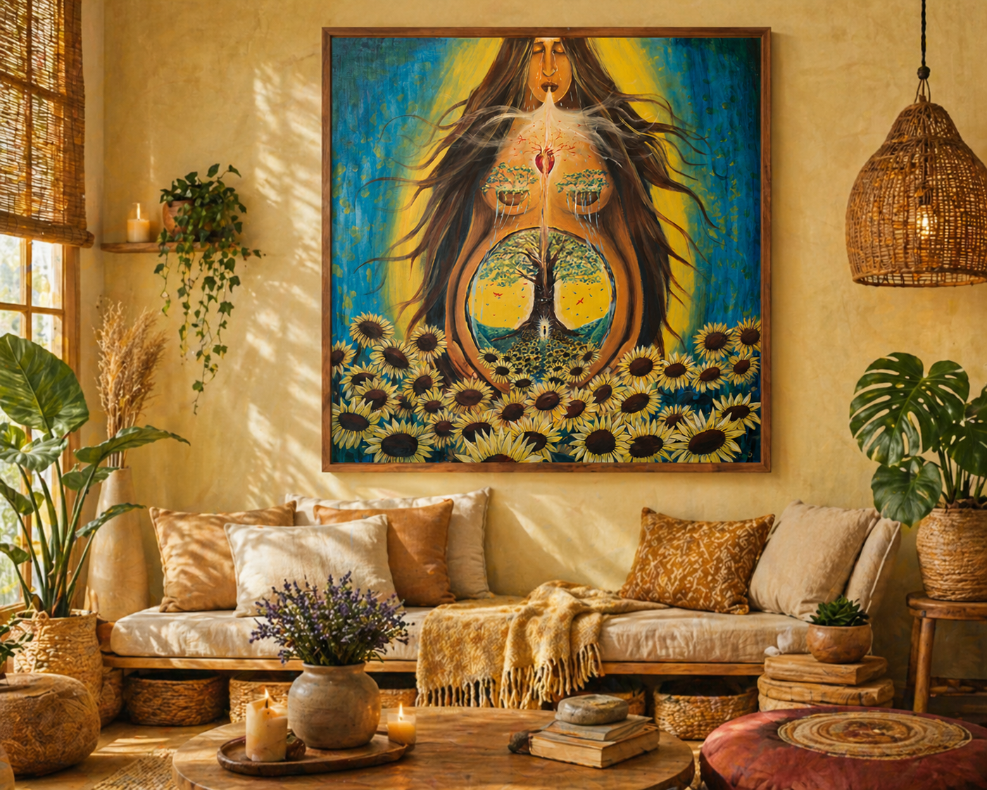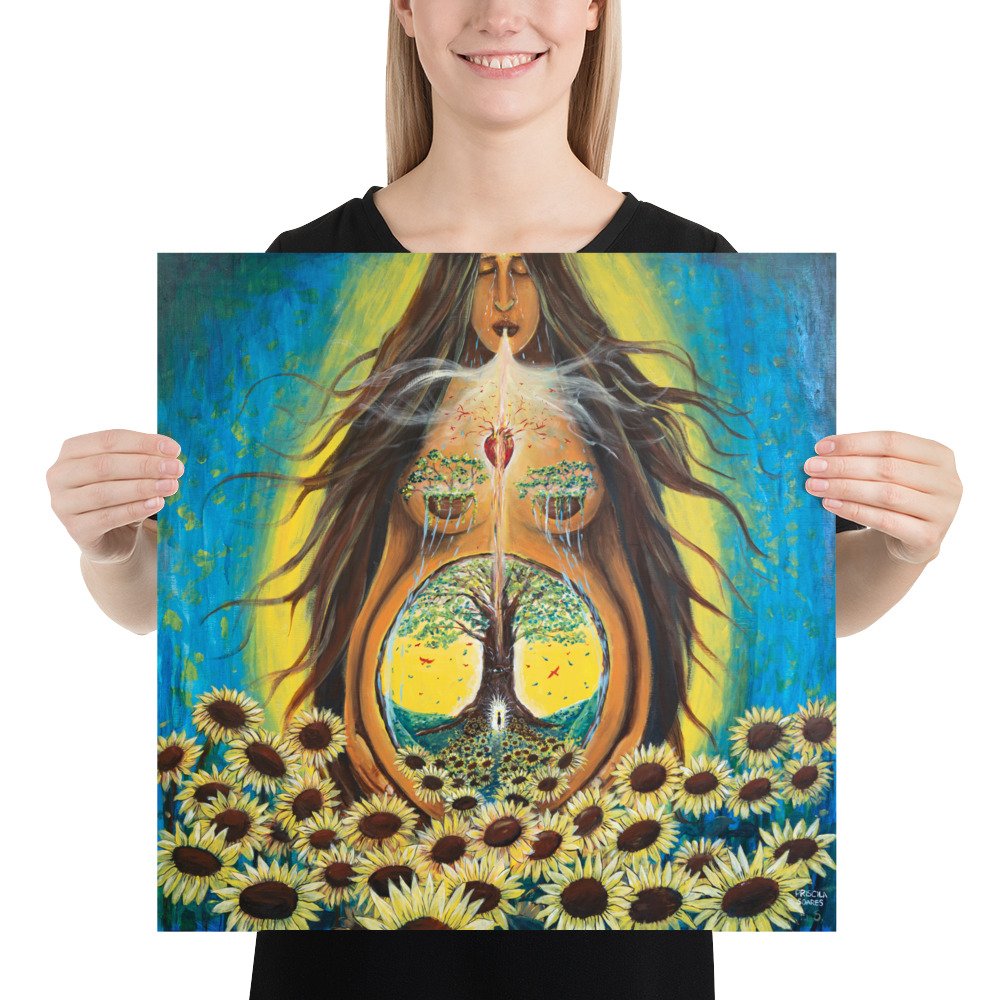 Her breath becomes a force of activation—moving through the heart, awakening the body, and giving rise to red birds that carry its energy into the world. Her tears, often seen as sorrow, become nourishment—feeding the earth, sustaining the sunflowers, and softening what once held pain.