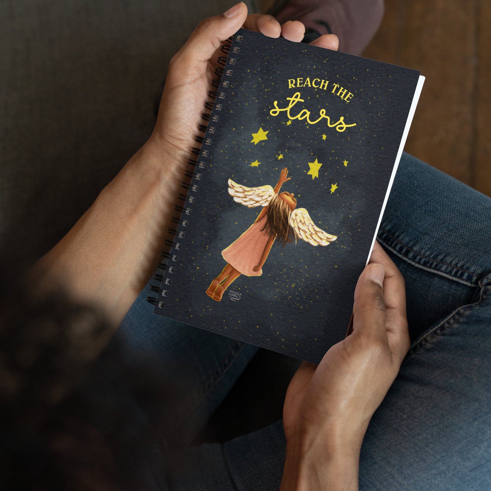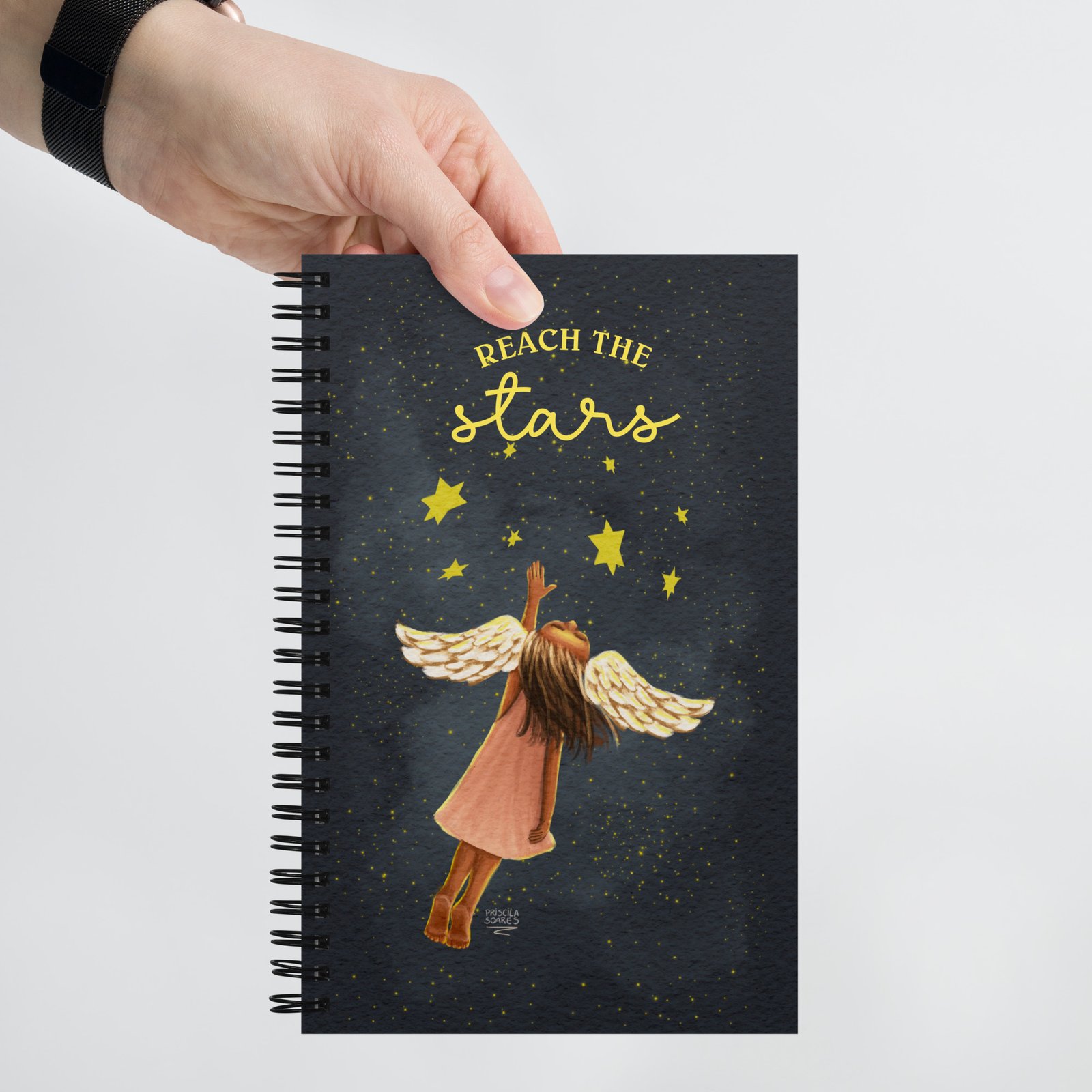 Let your imagination take flight with the Reach the Stars notebook. Featuring a whimsical illustration of a little girl soaring through space, wings sprouting from her ears, this notebook is a reminder that your dreams have no limits.